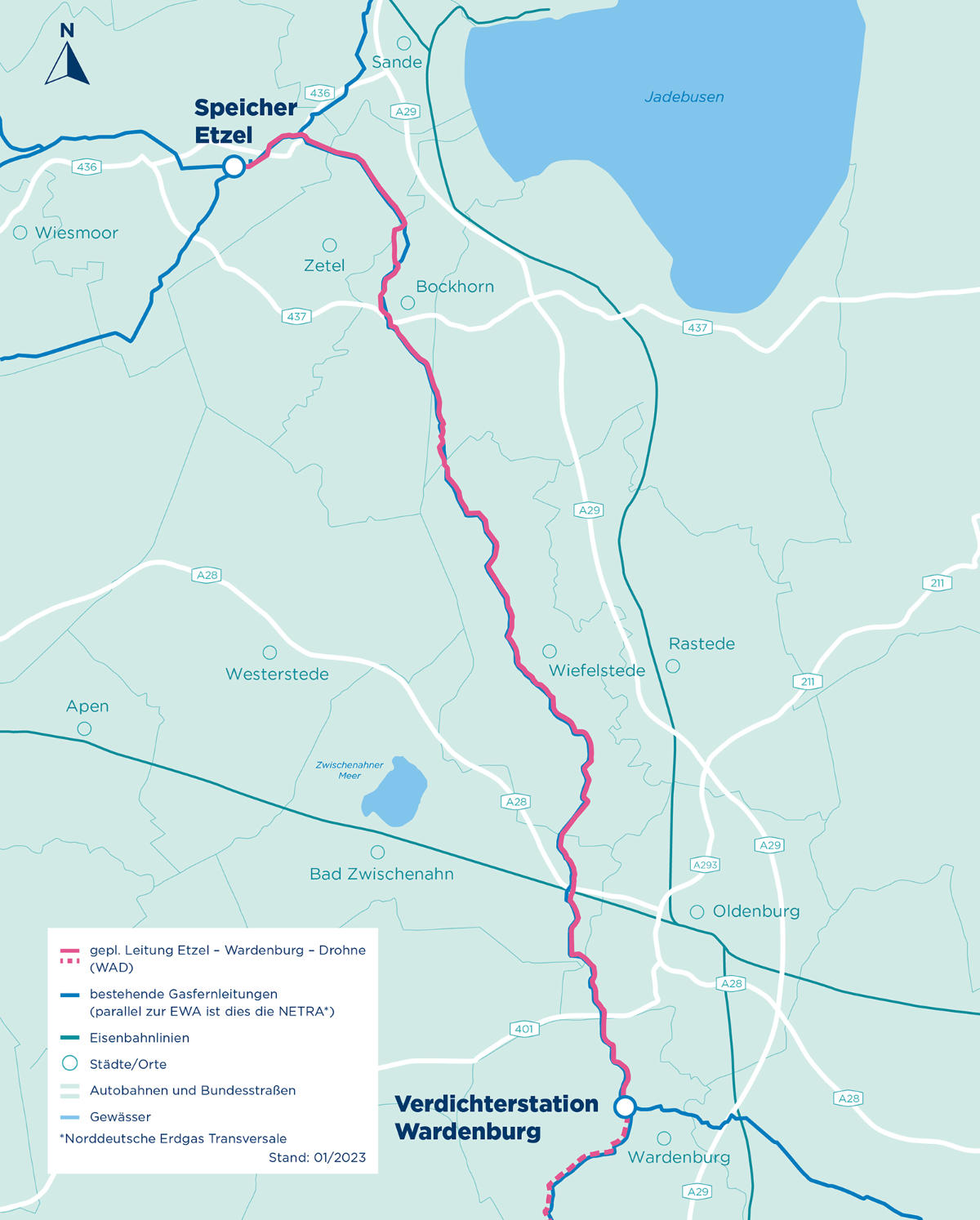 Der Leitungsabschnitt EWA schließt ab dem Speicher Etzel an die Wilhelmshavener-Anbindungsleitung (WAL) an. Die Trassenführung des 60 km langen Leitungsabschnitts EWA verläuft weitestgehend parallel zur bereits bestehenden Norddeutschen-Erdgas-Transversale (NETRA). Die Leitung Etzel-Wardenburg-Drohne transportiert zukünftig Erdgas aus den Niederlanden, Norwegen und Wilhelmshaven in das deutsche Ferngasnetz. Der Leitungsabschnitt Etzel-Wardenburg ist zudem für den Transport von Wasserstoff geeignet.