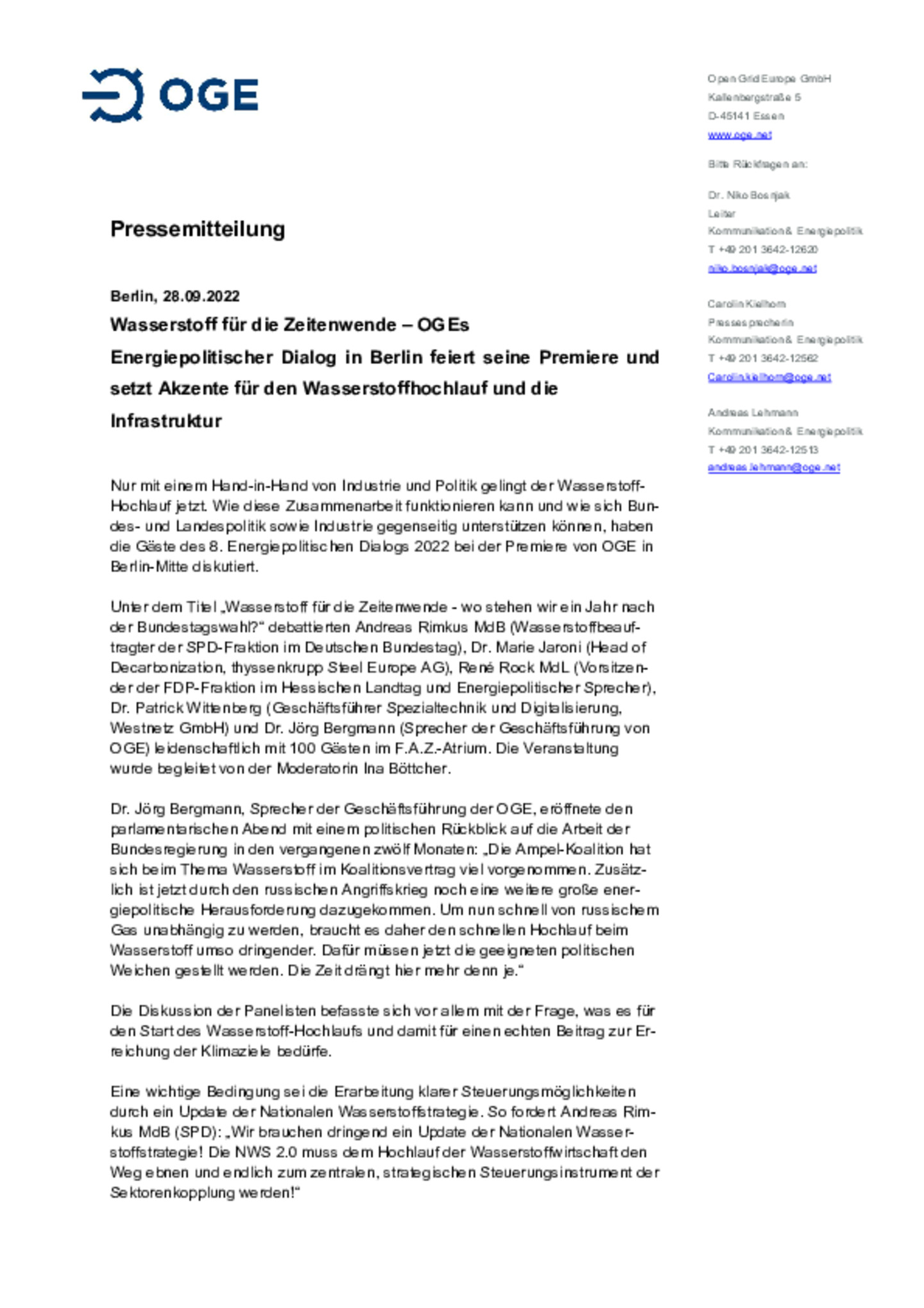 Nur mit einem Hand-in-Hand von Industrie und Politik gelingt der Wasserstoff-Hochlauf jetzt. Wie diese Zusammenarbeit funktionieren kann und wie sich Bundes- und Landespolitik sowie Industrie …gegenseitig unterstützen können, haben die Gäste des 8. Energiepolitischen Dialogs 2022 bei der Premiere von OGE in Berlin-Mitte diskutiert.
