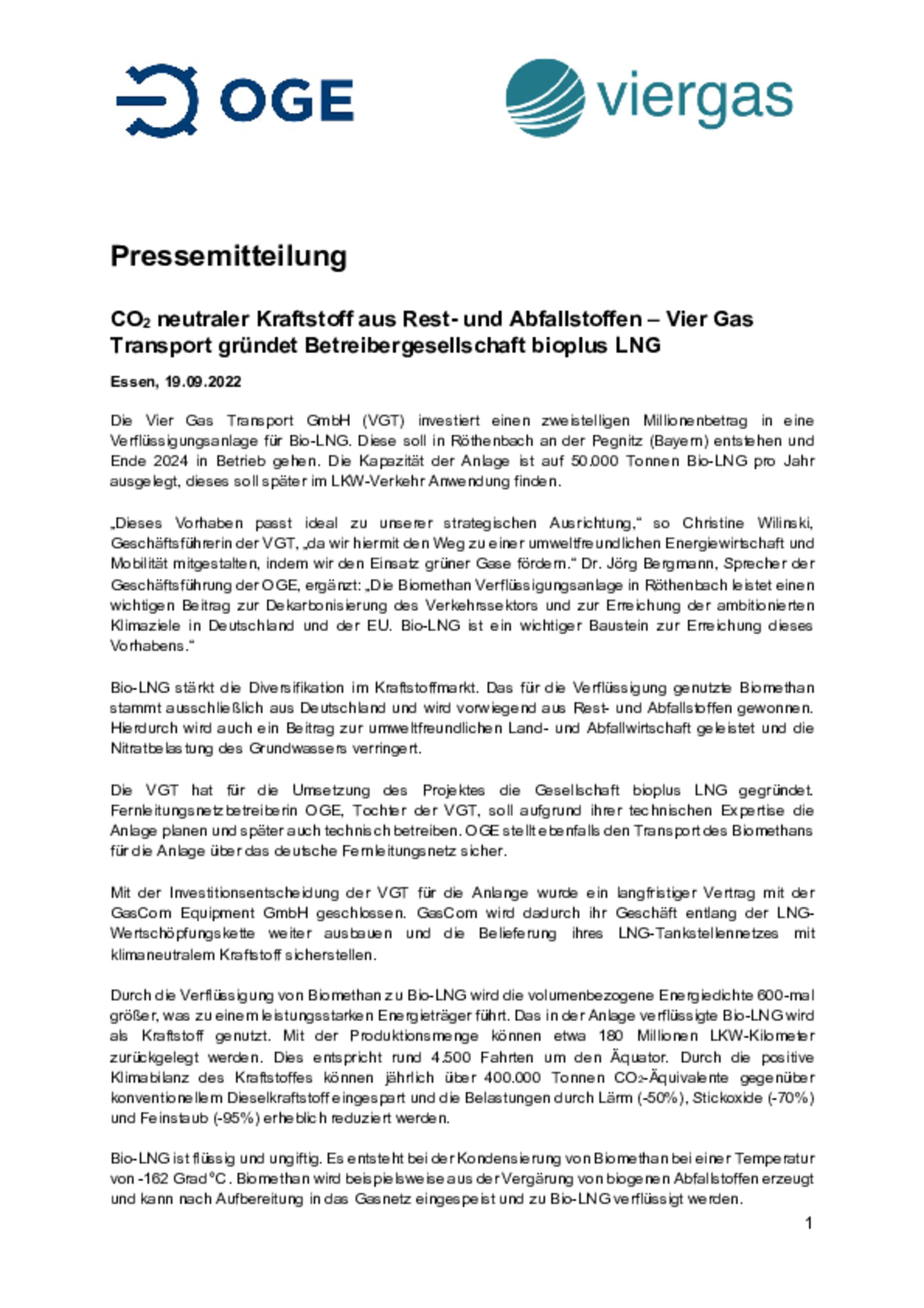 Die Vier Gas Transport GmbH (VGT) investiert einen zweistelligen Millionenbetrag in eine Verflüssigungsanlage für Bio-LNG. Diese soll in Röthenbach an der Pegnitz (Bayern) entstehen und Ende 2024 in …Betrieb gehen. Die Kapazität der Anlage ist auf 50.000 Tonnen Bio-LNG pro Jahr ausgelegt, dieses soll später im LKW-Verkehr Anwendung finden.