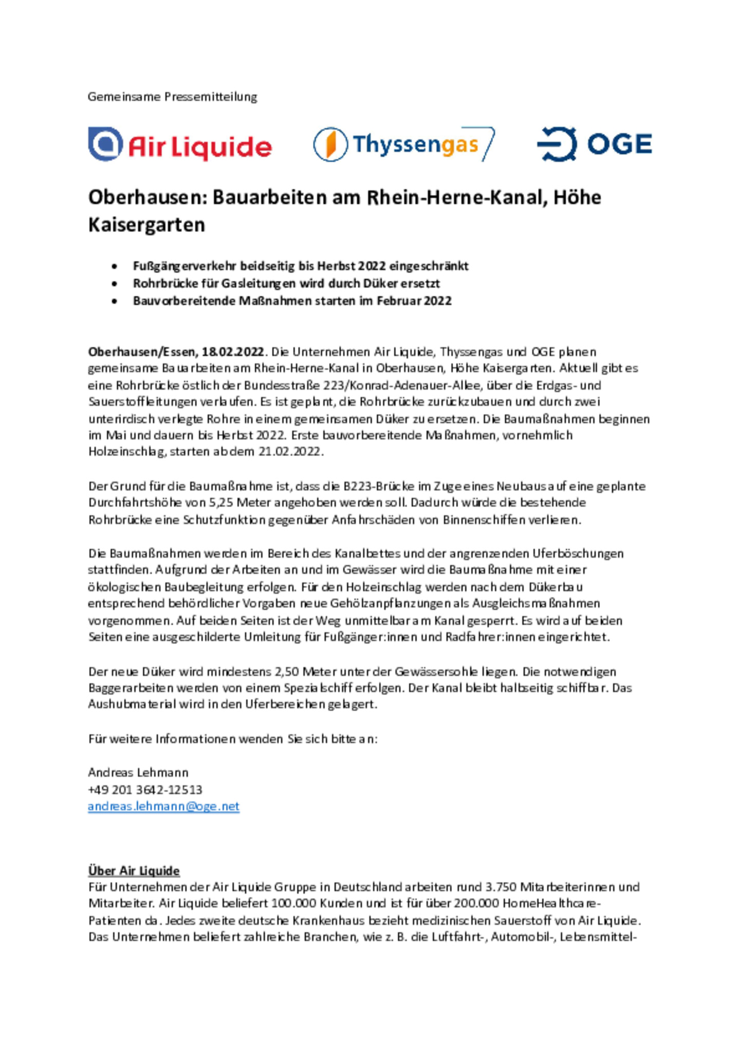Die Unternehmen Air Liquide, Thyssengas und OGE planen gemeinsame Bauarbeiten am Rhein-Herne-Kanal in Oberhausen, Höhe Kaisergarten.