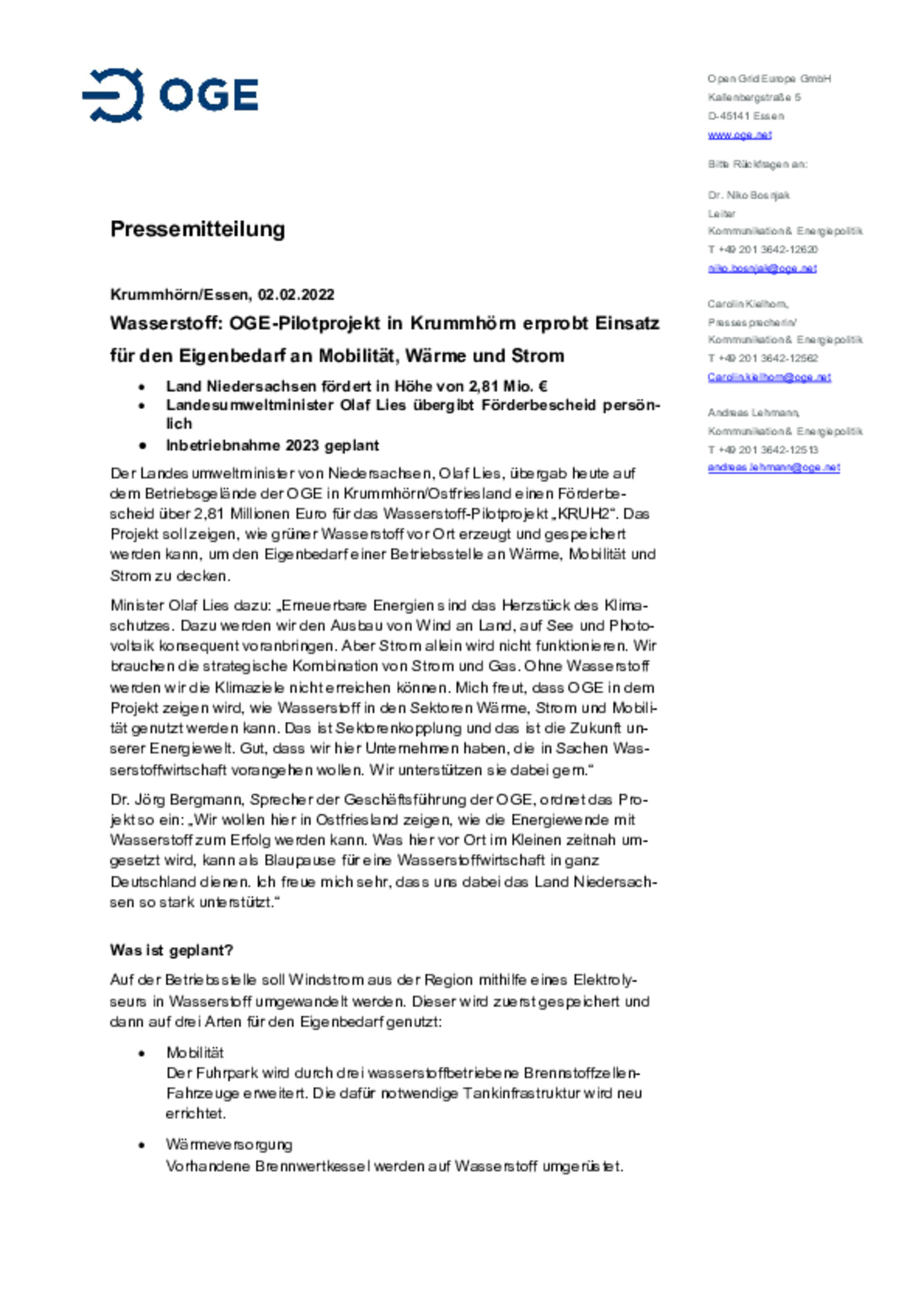 Der Landesumweltminister von Niedersachsen, Olaf Lies, übergab am 02.02.2022 auf dem Betriebsgelände der OGE in Krummhörn/Ostfriesland einen Förderbescheid über 2,81 Millionen Euro für das Wasserstoff-Pilotprojekt „KRUH2“. Das Projekt soll zeigen, wie grüner Wasserstoff vor Ort erzeugt und gespeichert werden kann, um den Eigenbedarf einer Betriebsstelle an Wärme, Mobilität und Strom zu decken.