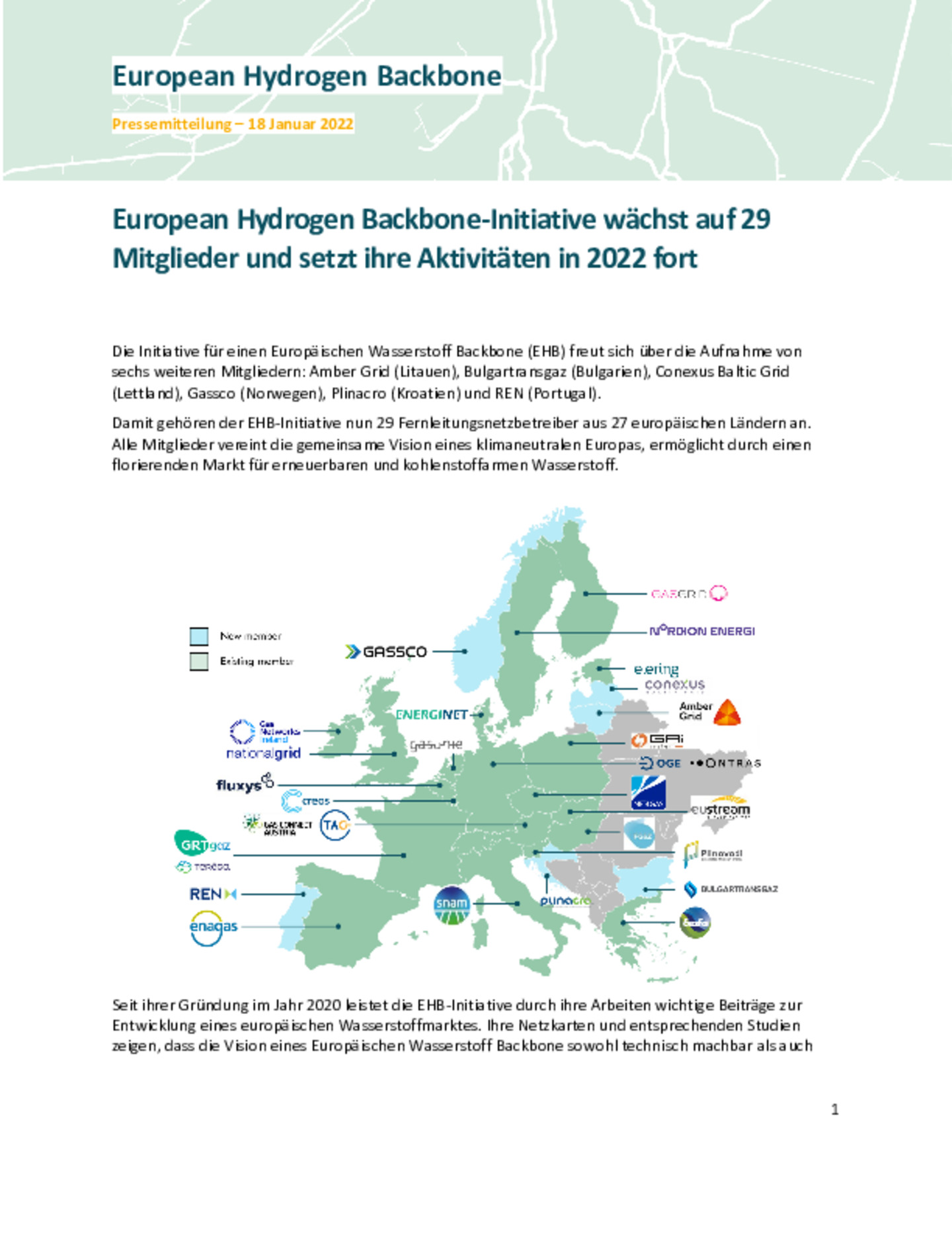 European Hydrogen Backbone-Initiative wächst auf 29 Mitglieder und setzt ihre Aktivitäten in 2022 fort