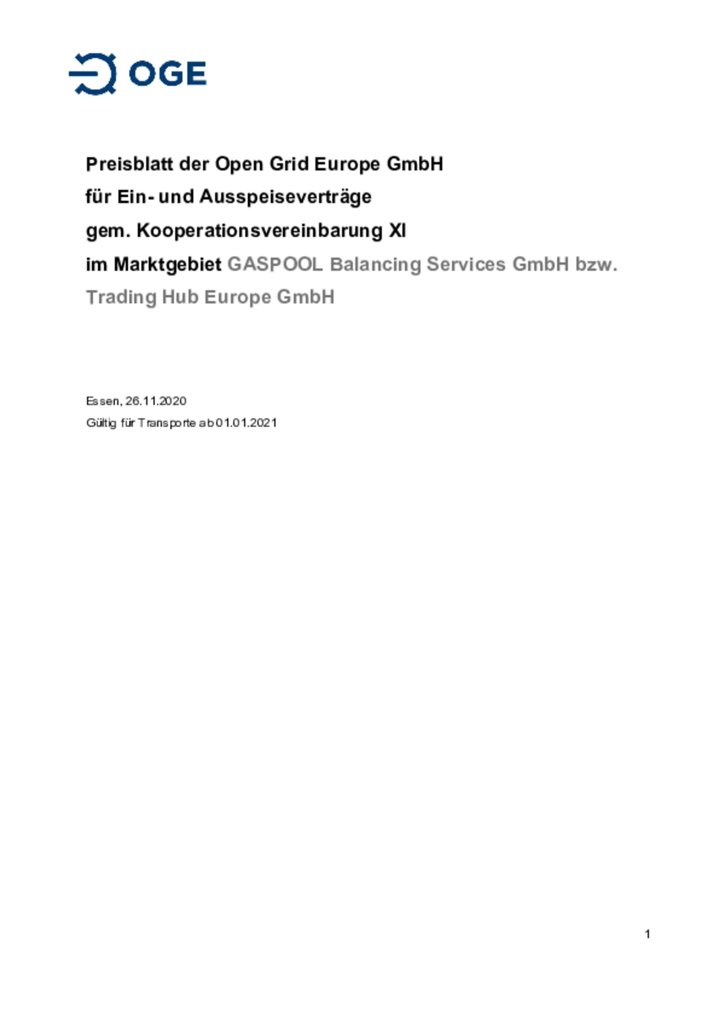 Preisblatt der Open Grid Europe GmbH für Ein- und Ausspeiseverträge gem. Kooperationsvereinbarung XI im Marktgebiet GASPOOL Balancing Services GmbH bzw. Trading Hub Europe GmbH
