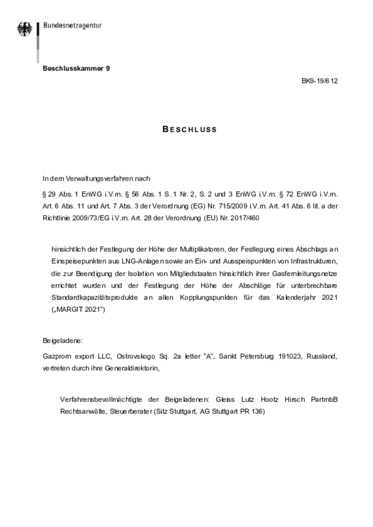 Beschluss der Bundesnetzagentur BK9-19/612