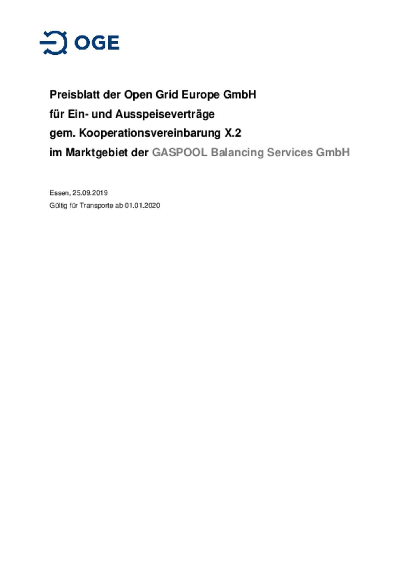 Preisblatt der Open Grid Europe GmbH für Ein- und Ausspeiseverträge sowie interne Bestellungen gem. Kooperationsvereinbarung X.2 im Marktgebiet der GASPOOL Balancing Services GmbH