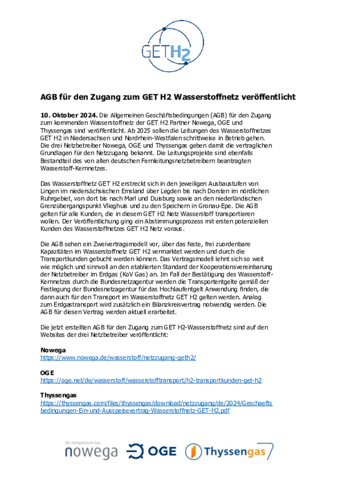 Die Allgemeinen Geschäftsbedingungen (AGB) für den Zugang zum kommenden Wasserstoffnetz der GET H2 Partner Nowega, OGE und Thyssengas sind veröffentlicht.