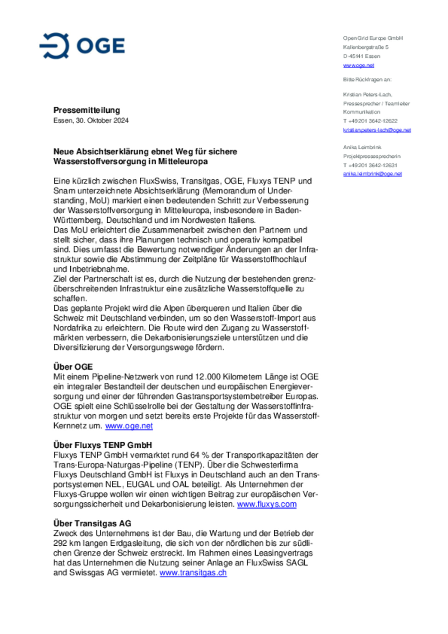Kommunikationsdatenblatt der Open Grid Europe