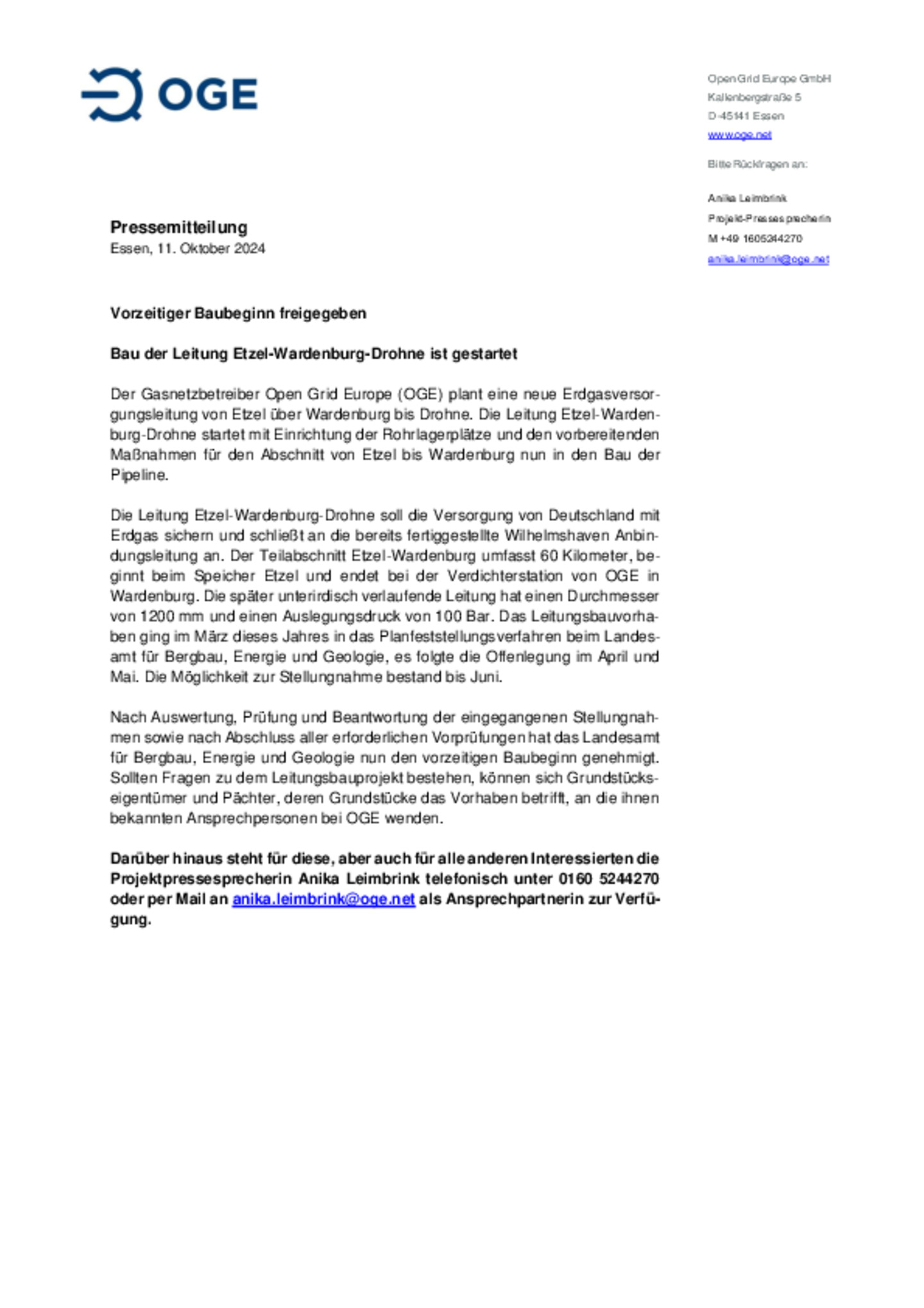 Pressefoto: Bau der Leitung Etzel-Wardenburg-Drohne ist gestartet