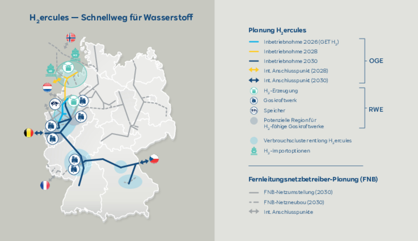 Um den Aufbau der Wasserstoffwirtschaft in Deutschland deutlich zu beschleunigen, haben OGE und RWE das nationale Infrastrukturkonzept „H2ercules“ entwickelt. Damit wollen die beiden Unternehmen den Aufbau einer Wasserstoffinfrastruktur vorantreiben. Diese soll Elektrolyseure sowie Speicher- und Importmöglichkeiten für grünen Wasserstoff im Norden mit industriellen Endverbrauchern im Westen und Süden Deutschlands verbinden. Weitere in Entwicklung befindliche Importrouten aus dem Süden und Osten sollen bis 2030 angeschlossen werden. So kann H2ercules das Rückgrat einer Wasserstoffinfrastruktur von der Nordseeküste bis nach Süddeutschland werden. Erste Großunternehmen, wie zum Beispiel thyssenkrupp, haben ihr Interesse signalisiert, an ein solches Netz angeschlossen zu werden.