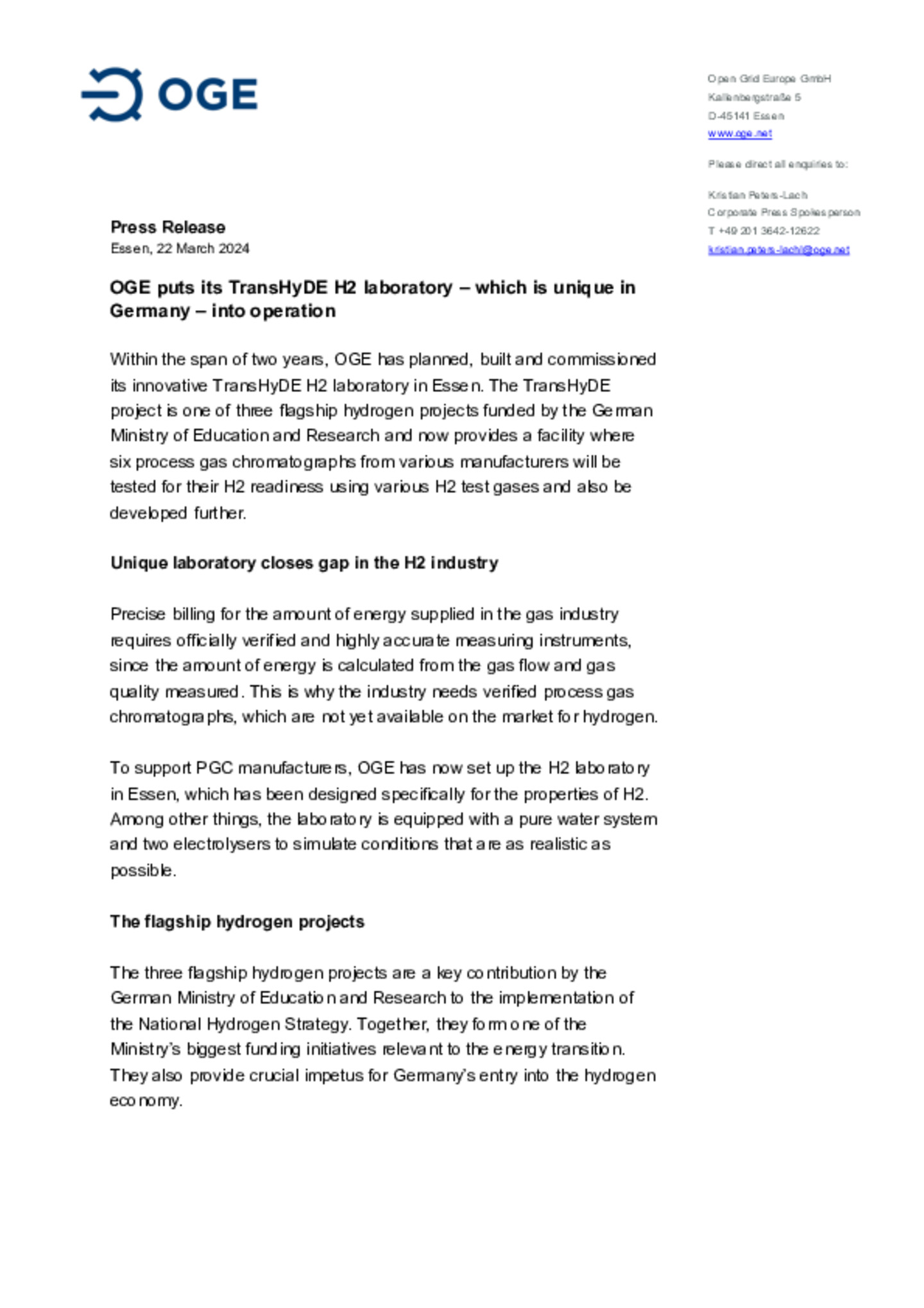 Within the span of two years, OGE has planned, built and commissioned its innovative TransHyDE H2 laboratory in Essen. The TransHyDE project is one of three flagship hydrogen projects funded by the …German Ministry of Education and Research.