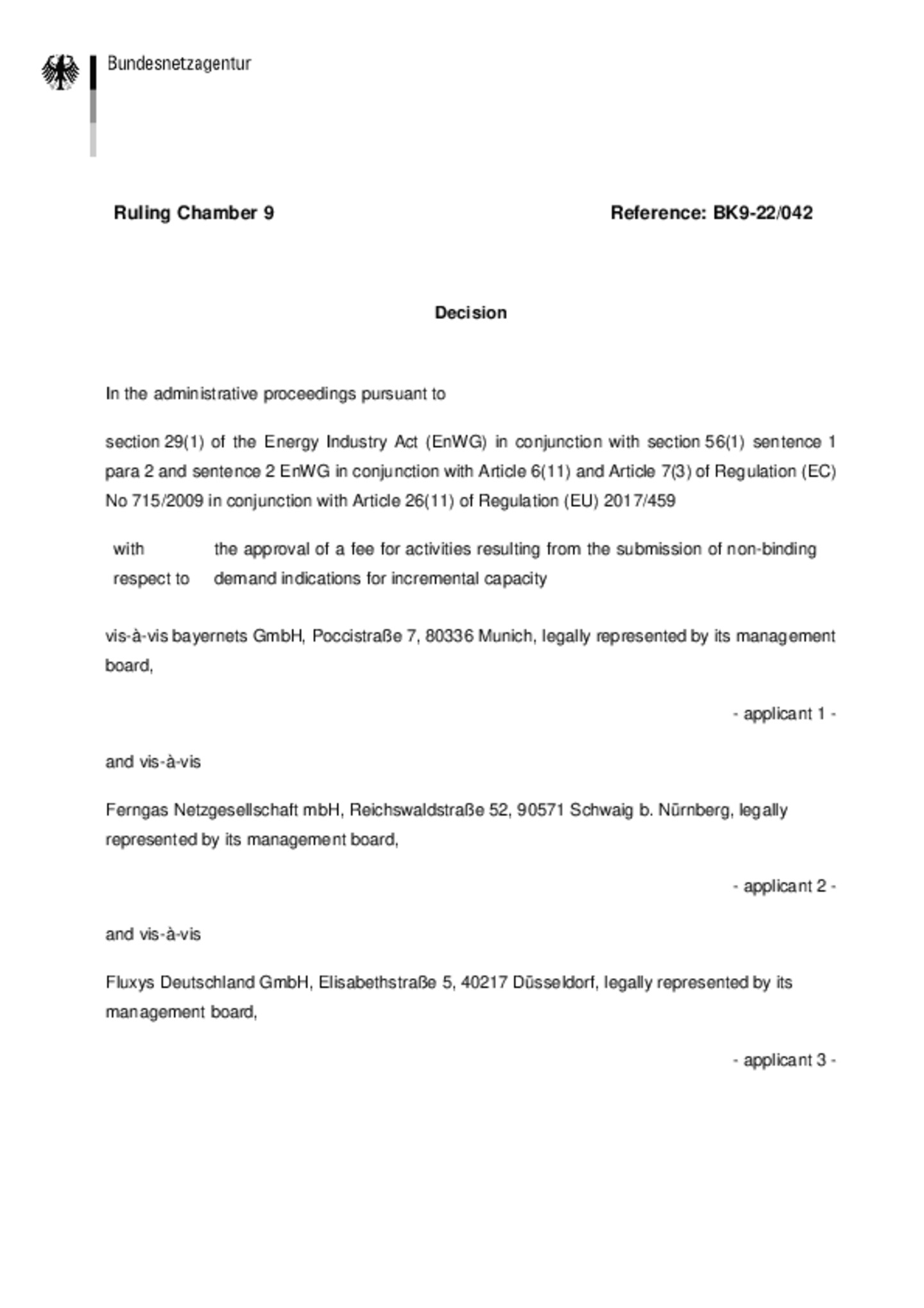 From the incremental capacity cycle 2023 - 2025 onwards, the German transmission system operators will charge a fee of €30,000 per market area border, type of request (incremental capacity or upgrade of existing capacity) and direction (entry or exit capacity) for their activities resulting from the submission of non-binding demand indications in accordance with Article 26 (11) of Regulation (EU) 2017/459 (NC CAM). Please note that the fee will also be charged if the transmission of the non-binding demand indication is not submitted to the applicants by the requesting party directly but by a third party (such as an adjacent, foreign TSO) (cf. point 37 BK9-22/042).