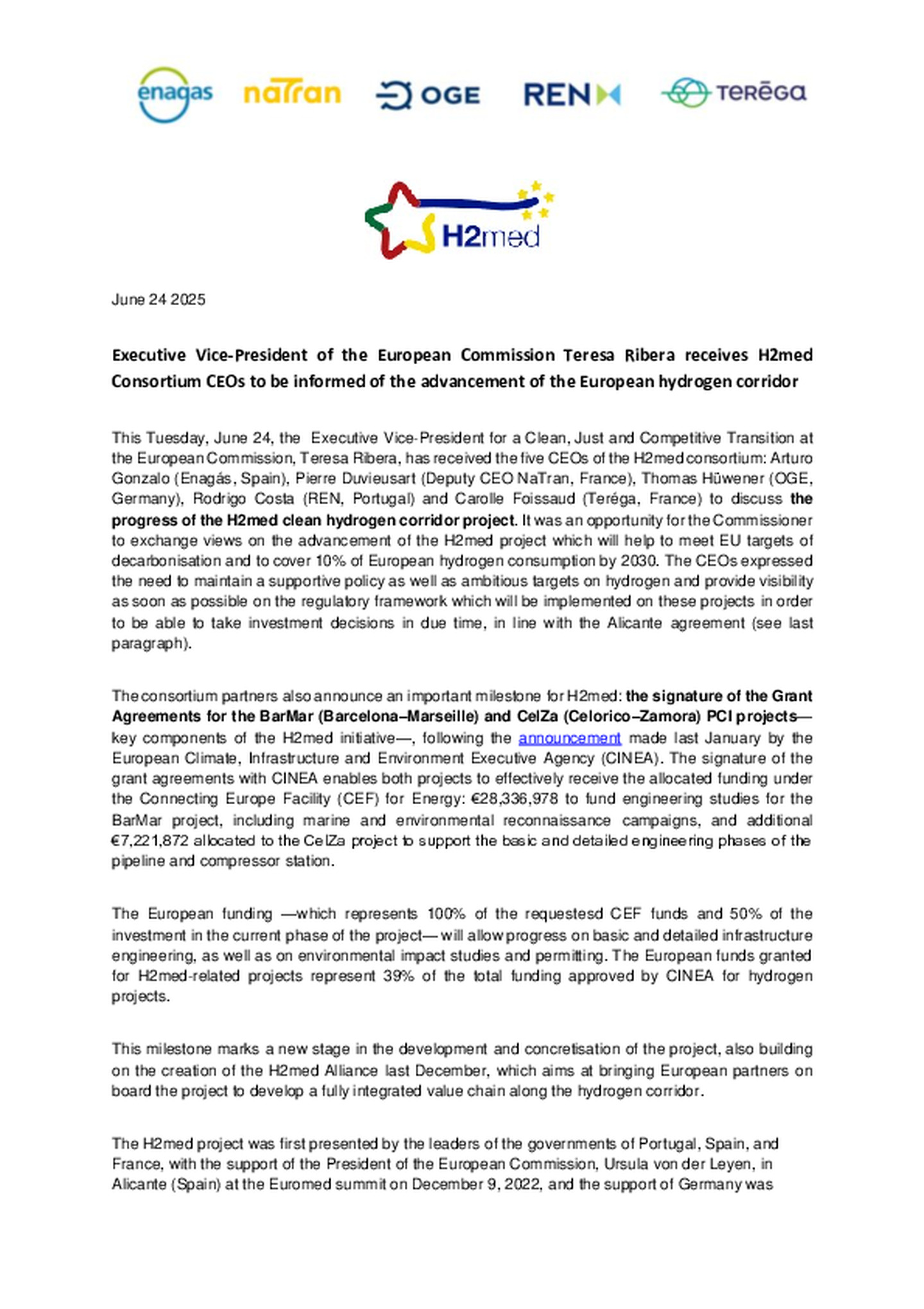 This Tuesday, June 24, the Executive Vice-President for a Clean, Just and Competitive Transition at the European Commission, Teresa Ribera, has received the five CEOs of the H2med consortium: Arturo Gonzalo (Enagás, Spain), Pierre Duvieusart (Deputy CEO NaTran, France), Thomas Hüwener (OGE, Germany), Rodrigo Costa (REN, Portugal) and Carolle Foissaud (Teréga, France) to discuss the progress of the H2med clean hydrogen corridor project