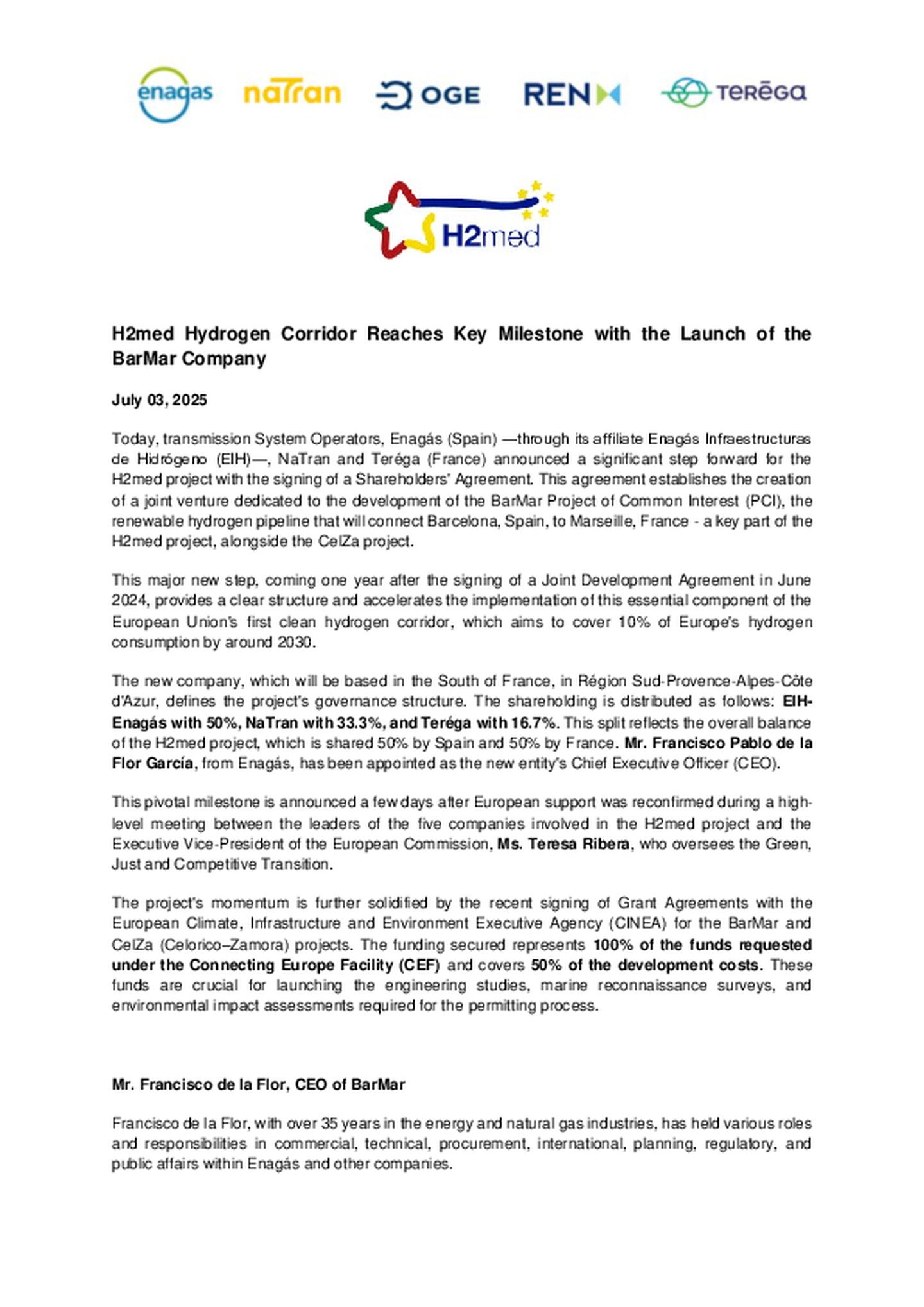 Today, transmission System Operators, Enagás (Spain) ―through its affiliate Enagás Infraestructuras de Hidrógeno (EIH)―, NaTran and Teréga (France) announced a significant step forward for the H2med project with the signing of a Shareholders' Agreement.